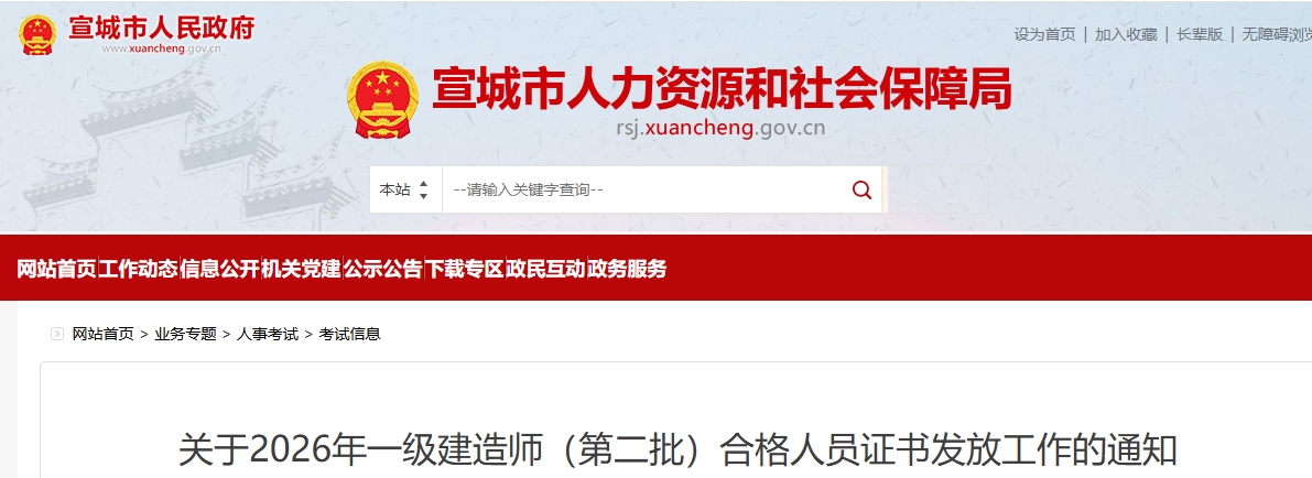 1月16日,宣城市人力资源和社会保障局发布《关于2026年一级建造师(第二批)合格人员证书发放工作的通知》,明确安徽宣城2025年度一级建造师证书领取和邮寄时间为1月19日上午9:00起。