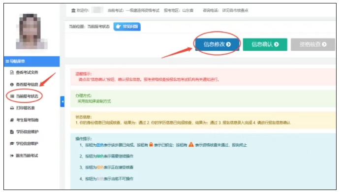 操作方式:原则上不允许修改信息。如需修改,考生需携带身份证原件、复印件及单位盖章的书面申请,到属地考试机构现场提交修改申请。如需修改身份证号、姓名等关键信息,考生需提供公安机关出具的证明材料,并联系考试机构进行人工审核。