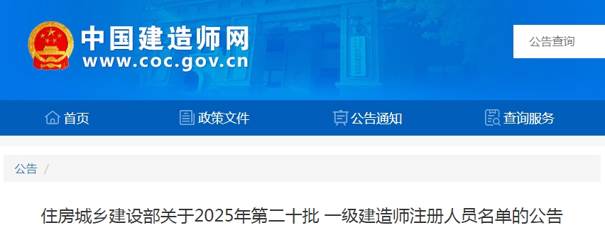 2025年第二十批一级建造师注册人员名单公告已发布,本批次共23839人符合一级建造师注册条件,其中,初始注册共1404人,延续注册4571人,增项注册325人,重新注册17539人。