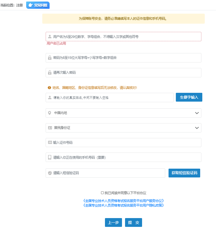 若提示证件号码已注册,请确认是否已注册,可通过【找回用户名或密码】功能进行查询,若没有信息可以继续注册。若查询到注册信息,忘记密码问题或手机号码已更换,需要找回密码的,请咨询报名地考试组织机构(点击查询联系方式)。