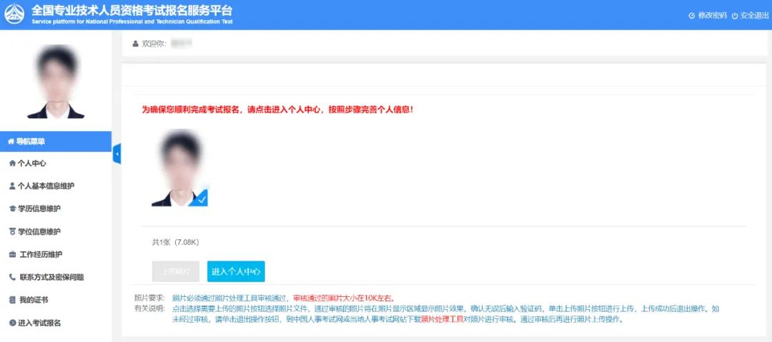 系统弹出照片上传成功的提示。点击【进入个人中心】按钮,进行数据完善。