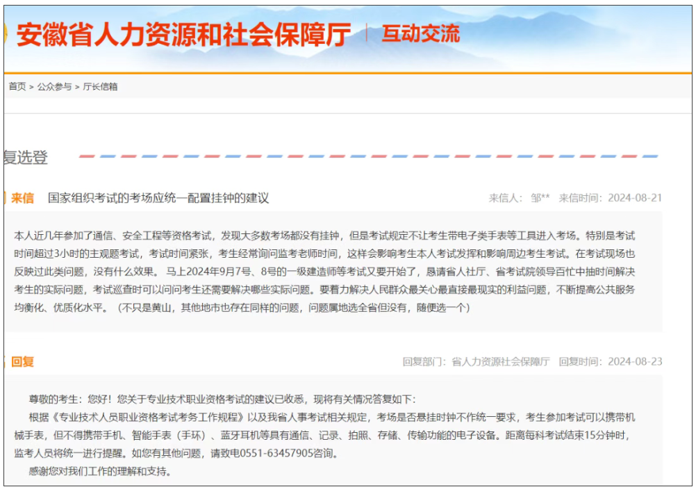 有考生询问一建考试期间没有手表不能看时间怎么办?安徽省人力资源和社会保障厅给出回应。