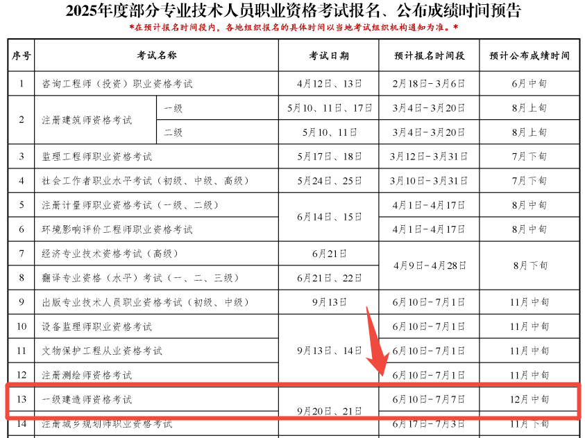 从中国人事考试网发布的《2025年度专业技术人员职业资格考试重要提示》获悉,2025年一级建造师成绩查询时间确定为12月中旬,具体时间以官网通知为准。