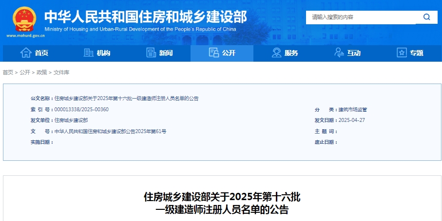 2025年第十六批一级建造师注册人员名单公告已发布,本批次共25328人符合一级建造师注册条件,其中,初始注册共1837人,延续注册4854人,增项注册384人,重新注册18253人。