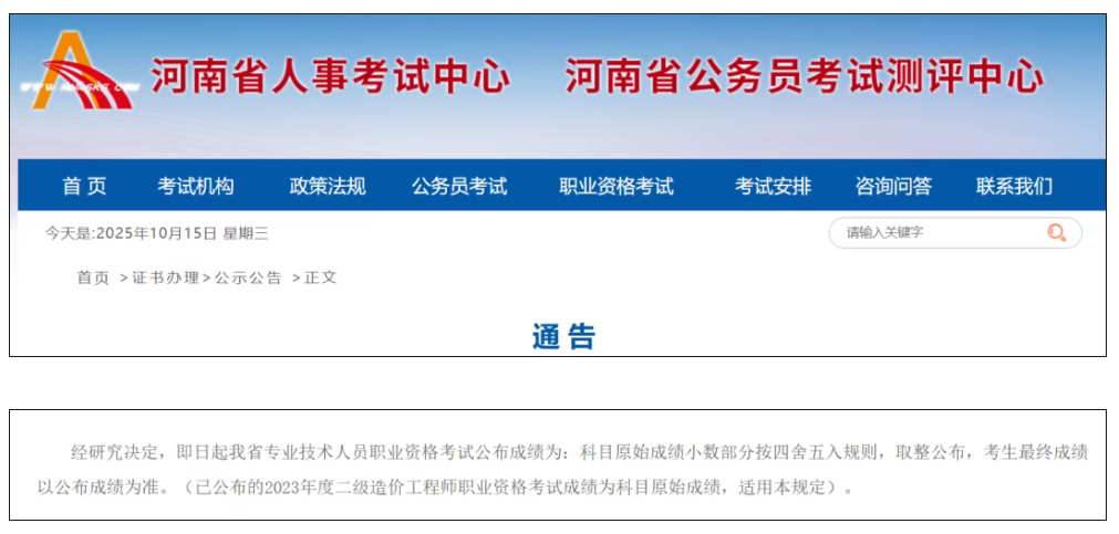 河南省人事考试中心就发了正式通知,明确专业技术人员职业资格考试的公布成绩,小数部分按四舍五入取整,考生最终成绩以公布成绩为准。