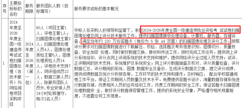 中标人在采购人的领导和监管下,承担2024-2026年度全国一级建造师执业资格考试试卷扫描图像处理及网上评分技术服务工作,提供扫描图像接收处理设备、计算机、服务器、存储设备,满足当年约20万份答题卡(每份为6张A4双面)的扫描图像处理及评分工作。