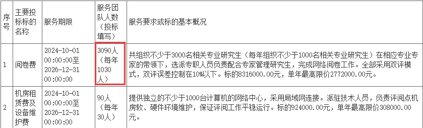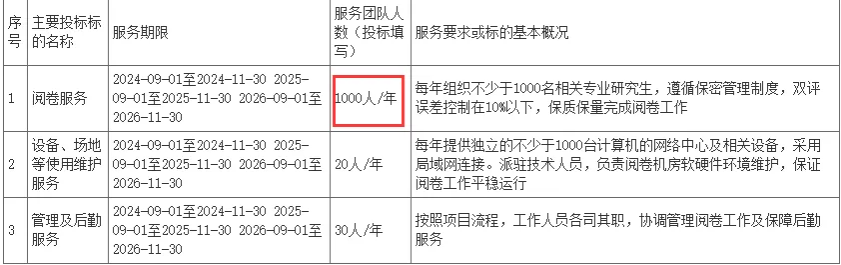 共组织不少于3000名相关专业研究生(每年组织不少于1000名相关专业研究生)在相应专业专家的带领下,选派专职人员负责配合专家管理研究生,完成网络阅卷工作。全部采用双评模式,双评误差控制在10%以下。