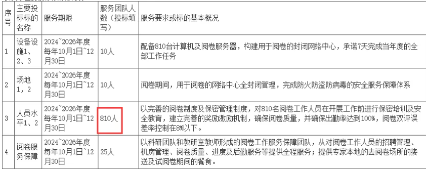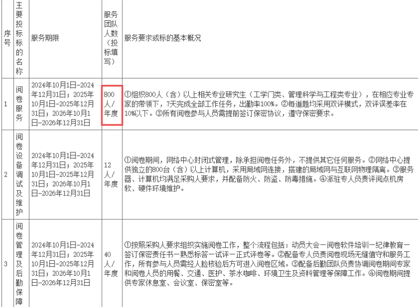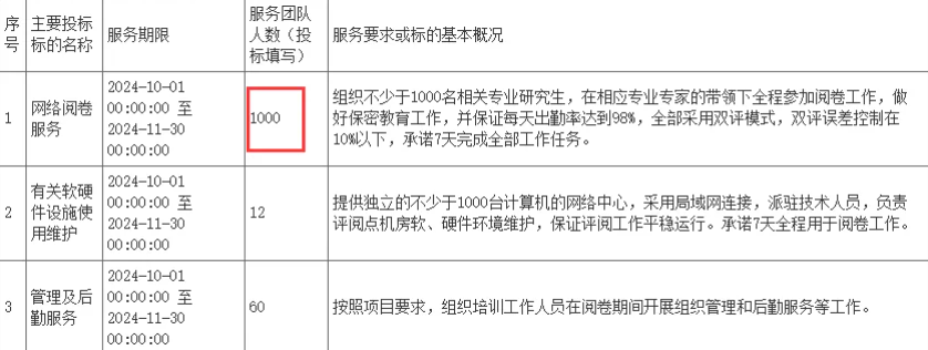 组织不少于1000名相关专业研究生,在相应专业专家的带领下全程参加阅卷工作,做好保密教育工作,并保证每天出勤率达到98%,全部采用双评模式,双评误差控制在10以下,承诺7天完成全部工作任务。