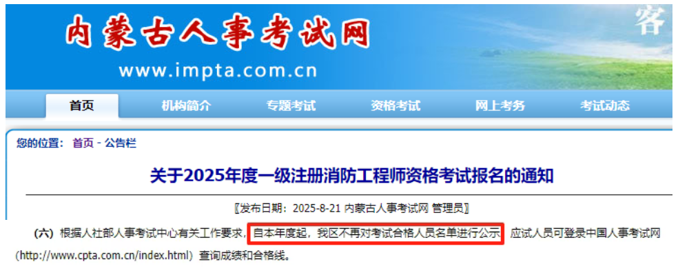 近日,小编在内蒙古发布的《2025年度一级注册消防工程师资格考试报名的通知》中发现:根据人社部人事考试中心有关工作要求,自本年度起,我区不再对考试合格人员名单进行公示。