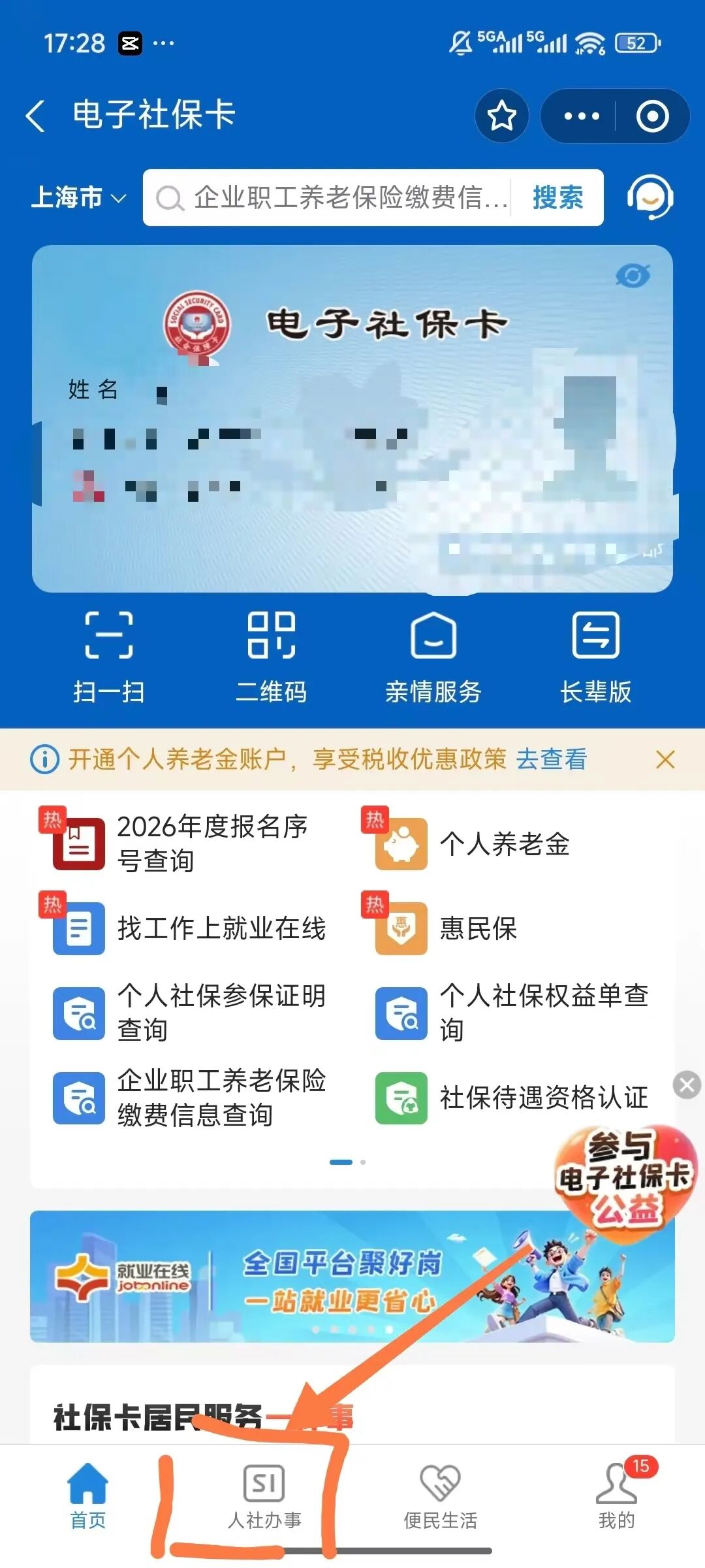 2、进入电子社保卡小程序后,点击底部菜单“人社办事”,