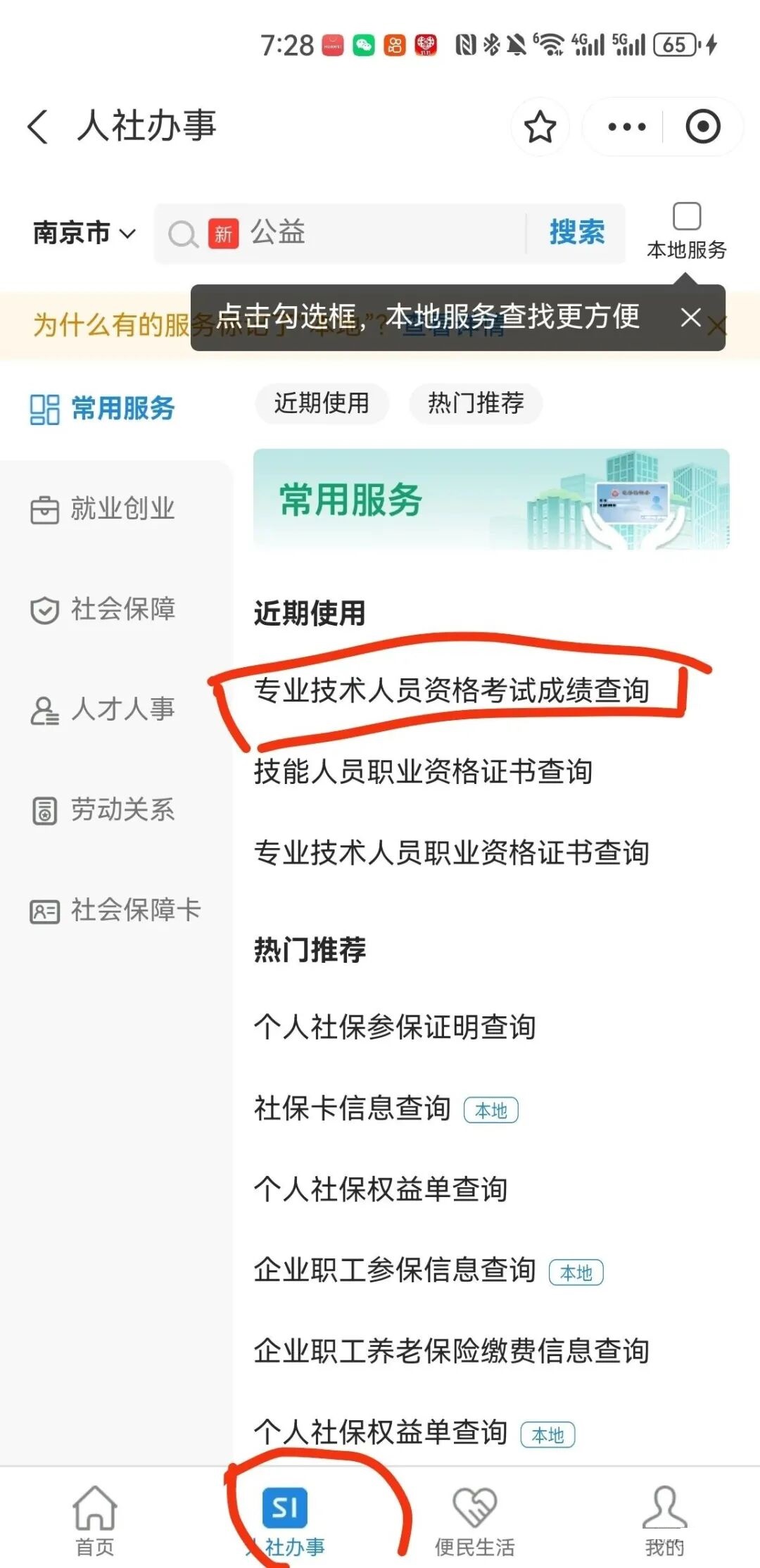 2. 手机端(微信,支付宝):打开微信或者支付宝搜索并进入“电子社保卡”小程序,点击底部“人社办事”并选择“人才人事”,再点击“专业技术人员资格考试成绩查询”,授权登录后选择考试年度与“一级建造师”就能查询