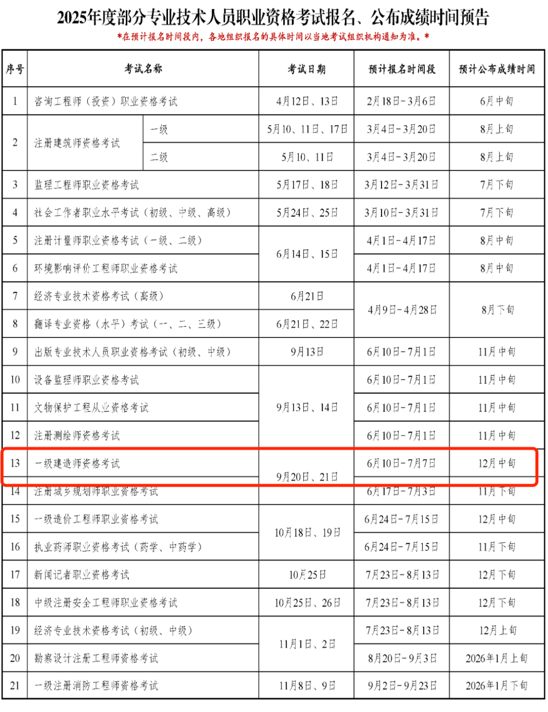 根据中国人事考试网2月18日发布的通知《2025年度专业技术人员职业资格考试重要事项提示》,其中公布了2025年一级建造师成绩查询时间预告,将于12月中旬公布考试成绩。