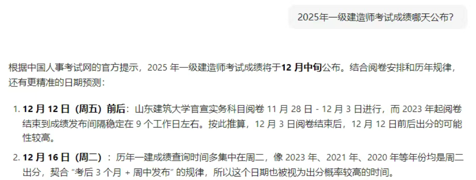 自从9月结束了2025年一级建造师考试后,如今过去2个月的时间,考试成绩却迟迟未出,让考生们一等再等。有一些焦急的同学专门找了AI,去问豆包究竟哪一天出成绩,而豆包给出的答案是……