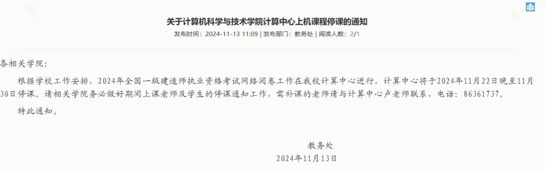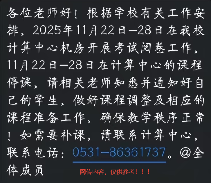 通知内容显示:根据学校有关工作安排,2025年11月22日-28日在我校计算中心机房开展考试阅卷工作,11月22日-28日在计算中心的课程停课,请相关老师知悉并通知好自己的学生,做好课程调整及相应的课程准备工作,确保教学秩序正常!