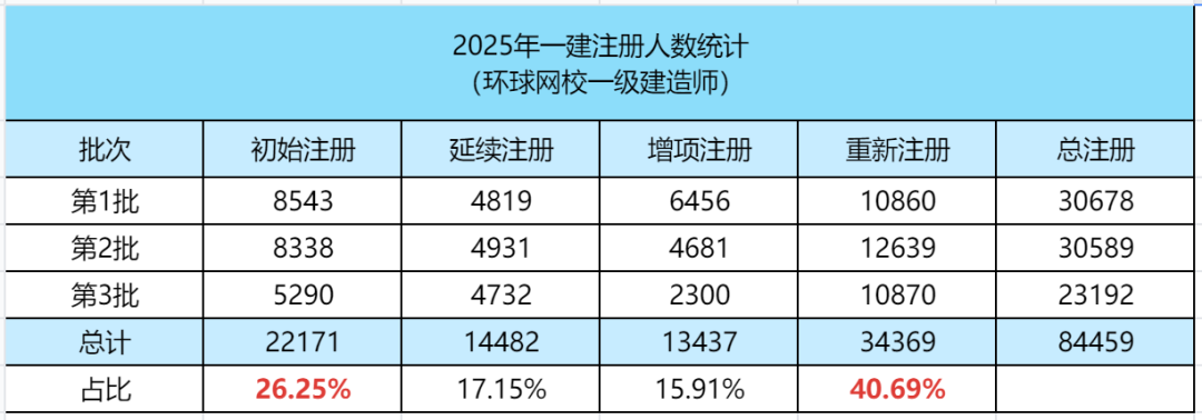 截止目前,住建部共公布了3批2025年一建注册人员名单,总共84459人通过注册。其中,初始注册人数为22171人,占比26.25%;延续注册共14482人,占比17.15%;增项注册共13437人,占比15.91%;重新注册34369人,占比40.69%。