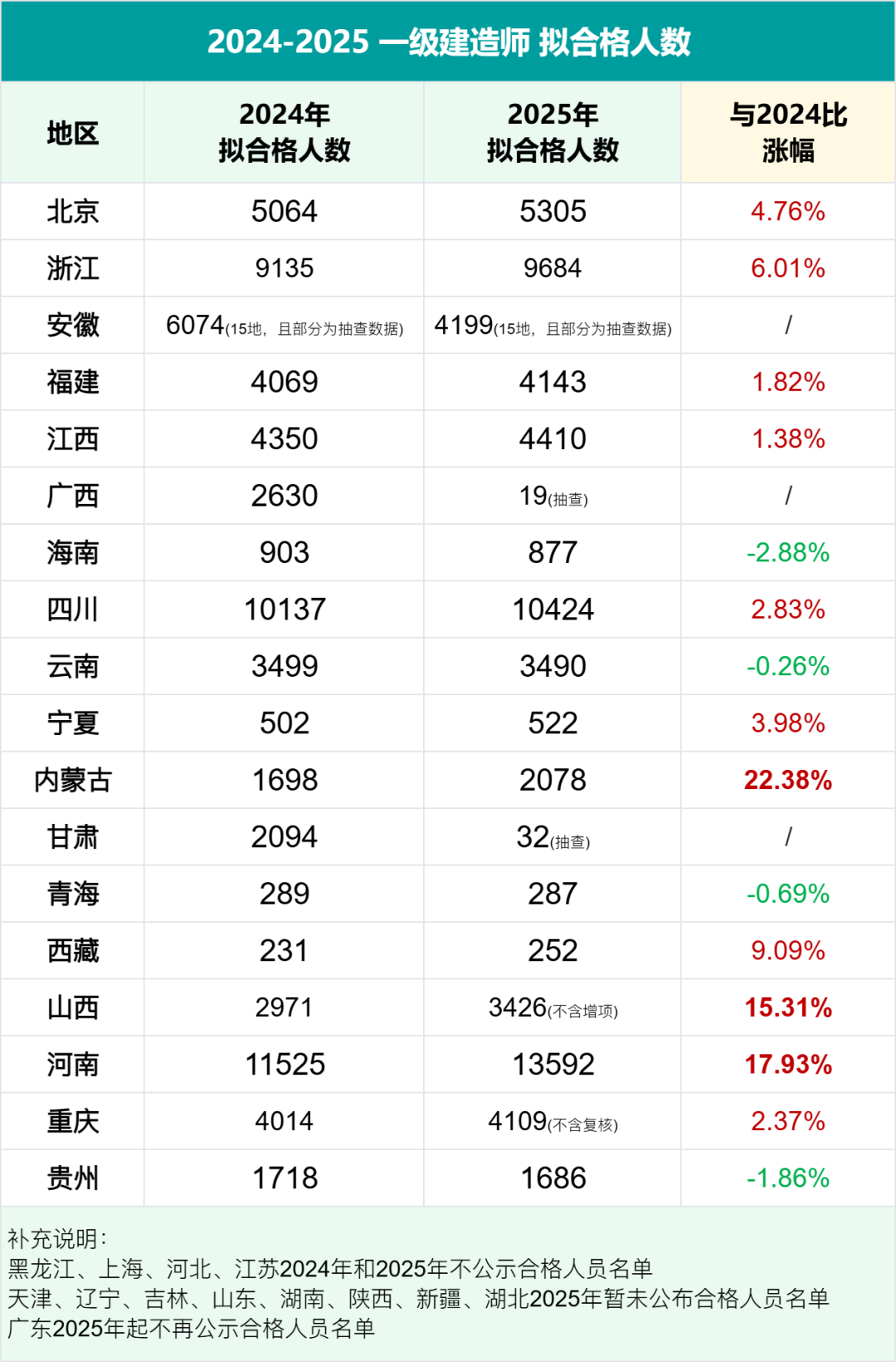 从已公布的数据来看,以上18地2025年总共通过了68535人,多个省份2025年一建合格人数比去年明显增加。
