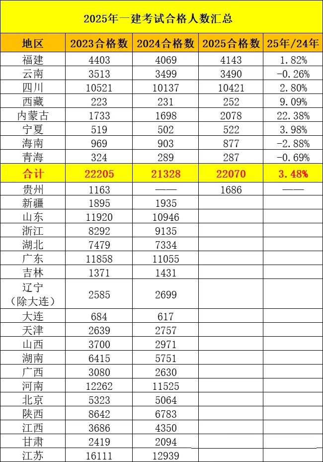 各地2025年一级建造师考试合格人数陆续公布,根据已经公布的8个地区统计来看,总共有22070人合格,相比去年增加了742人,具体如下。