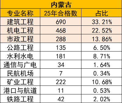从目前公布的地区来看,合格人数跟去年相差不大。只有内蒙古相比去年增加了380人,属于增加比较多的了。根据内蒙古各专业的合格数据看,仍然是建筑、机电、市政人数最多,但是矿业是222人合格,排第四了。