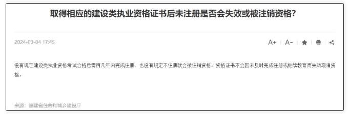 “没有规定建设类执业资格考试合格后需再几年内完成注册,也没有规定不注册就会被注销资格。所以证书不会因未及时完成注册或继续教育而失效取消资格。”