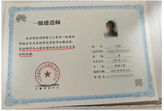 说明:一建主专业证书是红色,有加注,增项为蓝色,是合格证明,没有加注。