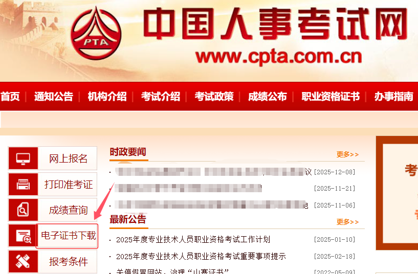 第一步:进入中国人事考试网(http://www.cpta.com.cn/),点击左侧【证书查验】栏目。