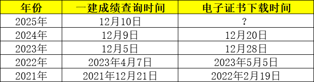 2025年一建考试成绩已公布,目前正在进行考后资格审核、合格名单公示,待考后资格审核结束,合格名单公示结束后,同学们就可以下载一建电子证书了,一般在成绩查询后一个月左右可以下载。