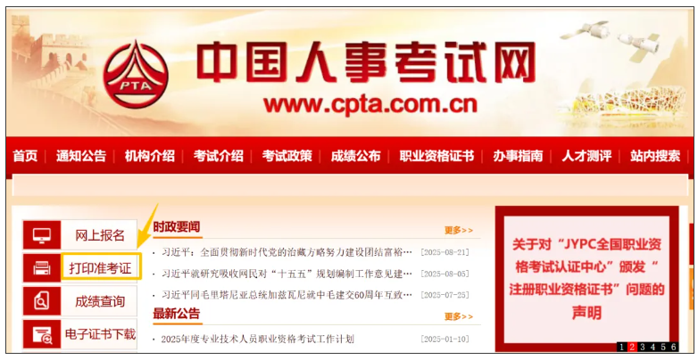 第一步:进入中国人事考试网,点击左侧“打印准考证”按钮。