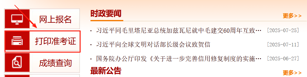 第一步:进入中国人事考试网(网址:http://www.cpta.com.cn/),点击左侧“打印准考证”按钮。