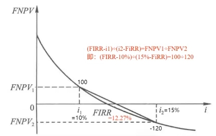 一正一负财务净现值,对应两个折现率;那么FIRR一定处于这两个折现率之间,而且FIRR值更靠近财务净现值绝对值小的折现率。