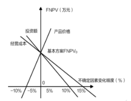 3条斜线分别表示的是:不确定因素(经营成本、投资额、产品价格)对评价指标(财务净现值)的影响。