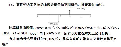 答:此解题方法没错。因为3到8年的净现金流量是等额系列现金流量,应用等额系列现金流量的现值公式(参见教材第9页1Z101012-12或13公式)可将3到8年的净现金流量折现到第3年初(即第2年末);又根据财务净现值的概念(参见教材第24页)——“……折现到投资方案开始实施时的现值和”,故需继续把3到8年已折到第2年末的值,再用一次支付现值公式(参见教材第9页公式1Z101012-10或1Z101012-11)折现到方案开始实施时,即0期。只有将方案计算期所有净现金流量按预定的基准收益率折现到0期的现值和,才称为财务净现值。