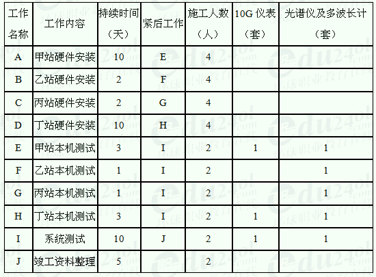 案例2.:2007真题案例五. 背景资料:某DWDM传输设备安装工程由甲、乙、丙、丁四个站组成,其中甲站、丁站为终端站,乙站、丙站为光放站。本工程新建一套公务系统、一套网管系统,施工单位承包方式为包工不包料。项目经理对工程进行工作分解后,根据工程量列出了工作的持续时间,所需主要资源以及工作的工艺关系如下表所示: