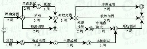 例4. 背景资料: 某省内传输网工程,包括线路和设备两部分。光缆沿线与原有光缆、铁路交越。建设单位和施工单位签定了承包合同,合同工期16周;交越过路手续和赔补由建设单位负责,钢管、水泥、沙石由施工单位采购。施工单位提交了初步的施工进度网络计划并得到了建设单位的批准,如下图所示(每周按7天计算):