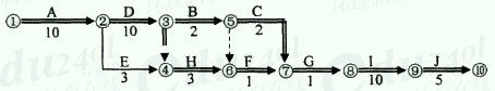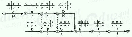 (关键路径2分,时间参数两个1分,共5分) 本工程的计算工期为42天(1分) 2.(本小题4分) 人工及人员直接开支成本=(4×10+2×4+2×4+10×4+3×2+1×2+1×2+3×2+10×2+5×2)×1000=142000元(1分) 仪表成本=(3+3+10)×5000+(3+1+1+3+10)×500=89000元(1分) 管理成本=42×1500=63000(1分) 总计划成本=142000+89000+63000=294000(1分) 3.(本小题8分)