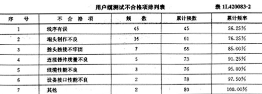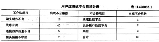 44、在X市本地网通信线路工程中,某施工处承担户线安装部分,包括分线设备下线(称爬杆线)和用户室外线两部分。线缆走向整齐、合理,并于8日30日全部安装完成,从9月1日开始由技术人员对线缆进行测试,在测试过程中发现其中存在很多质量问题,统计如表1L420083-1所示:
