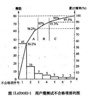 标准答案:(1)首先将在测试过程中发现的不合格项原始资料进行加工整理,画出排列表和绘出排列图。采取排列图法可直观地看出影响质量的主要因素,便于有针对性的前期预防和后期检查,确保工程质量。如表1L420083-2