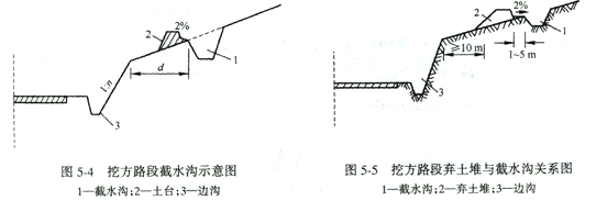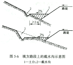 山坡上路堤的截水沟离开路堤坡脚至少2.Om,并用挖截水沟的土填在路堤与截水沟之间,修筑向沟倾斜坡度为2%的护坡道或土台,使路堤内侧地面水流人截水沟排出。