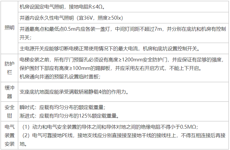 设备进场验收→土建交接检验→井道照明及电气安装→井道测量放线→导轨安装→ 曳引机(主机)安装→ 限速器安装→机房电气装置安装→轿厢、安全钳及导靴安装→轿厢电气安装→缓冲器安装→对重安装→曳引钢丝绳、悬挂装置及补偿装置安装→开门机、轿门和层门安装→层站电气安装→调试→检验及试验→验收。