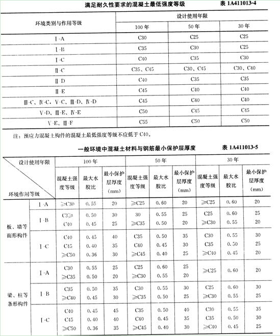 结构构件的混凝土强度等级应同时满足耐久性和承载能力的要求,故《混凝土结构耐久性设计规范》GB/T 50476——2008中对配筋混凝土结构满足耐久性要求的混凝土最低强度等级作出了相应规定,见表1A411013-4。