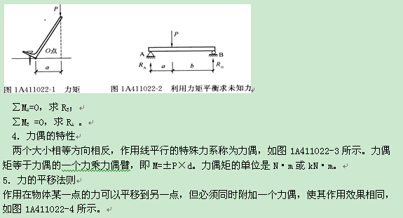 力使物体绕某点转动的效果要用力矩来度量。“力矩=力×力臂”,即M=P·a。转动中心称力矩中心,力臂是力矩中心O点至力P的作用线的垂直距离a,见图1A411022—1。力矩的单位是N·m或kN·m。