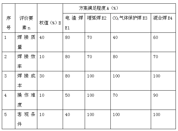 某机电安装公司承建了一植物油厂的锅炉机电安装工程,为保证质量、加快进度、降低成本,该公司项目部组织有关技术人员进行施工方案设计,为了选择确定能保证焊接质量的焊接方法,已初选出电渣焊、埋弧焊、CO2气体保护焊、混合焊四个焊接方案。根据调查资料和本公司实践经验,已定出各评价要素的权重及方案的评分值,见下表。