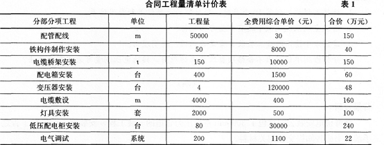 某安装公司中标了某贸易中心大楼的电气安装工程,该工程采用以人工费为取费基数的全费用综合单价计价。中标工程量清单如表1所示,措施项目总费用为210万元。