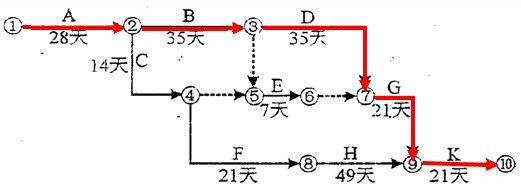 1.本工程计划总工期=(28+35+35+21+21)天=140天,实际总工期=(140+10+7)天=157天。