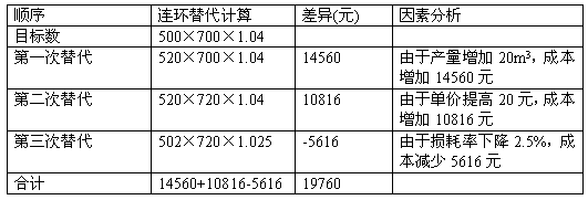 某混凝土工程,目标成本为364000元,实际成本为383760元。根据下表相关资料进行项目成本分析。 |