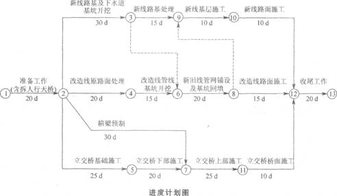 第33题 某公司承接了某城市道路的改扩建工程。工程中包含一段长240m的新增路线(含下水道200m)和一段长220m的路面改造(含下水道200m),另需拆除一座旧人行天桥,新建一座立交桥。工程位于城市繁华地带,建筑物多,地下管网密集,交通量大。新增线路部分地下水位位于一4.0m处(原地面高程为±0.0m),下水道基坑设计底高程为一5.5m,立交桥上部结构为预应力箱梁,采用预制吊装施工。项目部组织有关人员编写了施工组织设计(其中进度计划如下图所示),并绘制了一张总平面布置图,要求工程从开工到完工严格按该图进行平面布置。