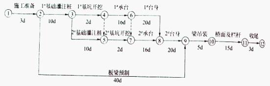 某市政跨河桥上部结构为长13m单跨简支预制板梁,下部结构由灌注桩基础、承台和台身构成。施工单位按合同工期编制了网络计划图,如下图所示,经监理工程师批准后实施。