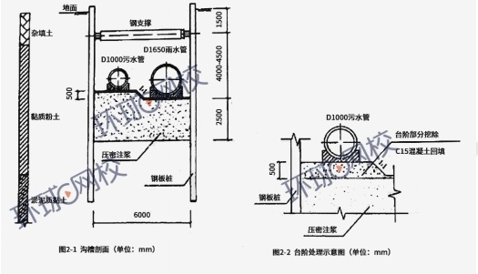 某市政道路更新工程,需新建D1650雨水管和D1000污水管各一根,长度均为580m。两根管道同沟槽明挖施工,管道槽底标高相差500mm。地层为杂填土、黏质粉土,淤泥质黏土,地下水丰富。沟槽围护采用钢板桩+钢支撑,槽底下方土体进行压密注浆加固,沟槽断面图见图2-1。