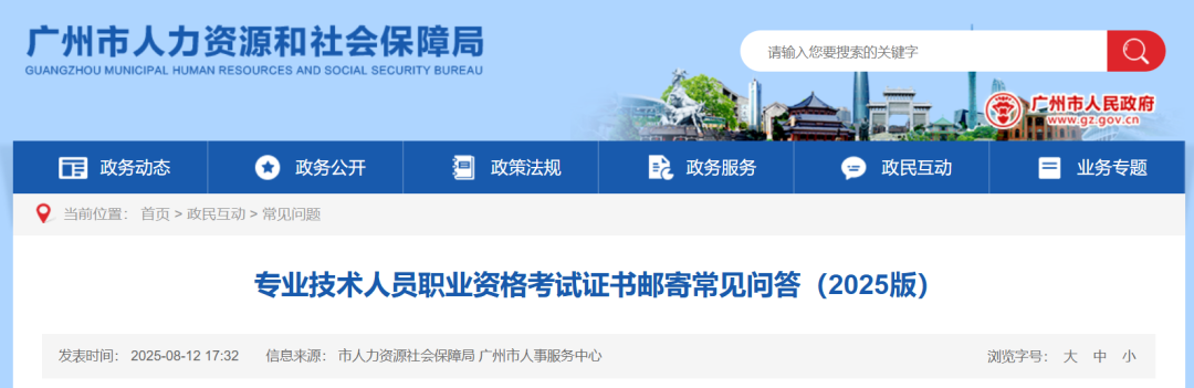 其他未申请证书直邮的,或不属于上述17项试点证书直邮职业资格范围内的,合格人员纸质证书由考生报名所在地市人事考试机构负责发放。广州考区的考生可访问广州市人力资源和社会保障局官网“业务专题-人才工作-人事考试-领证通知”专栏,或关注微信公众号“广州市人事服务中心”查看对应的领证通知,并按通知指引登录系统申请纸质证书邮寄。