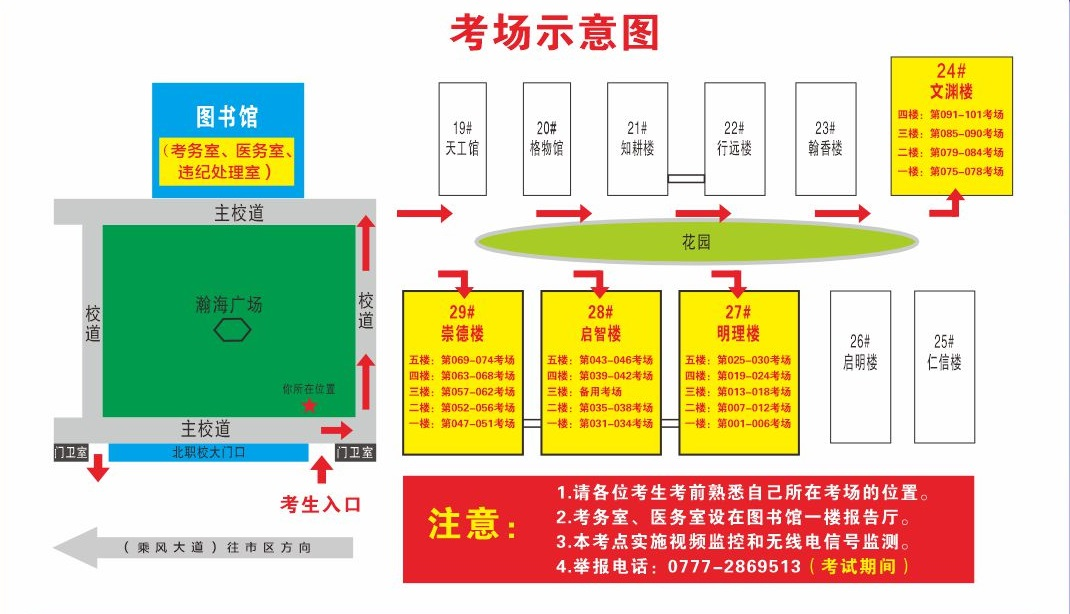 北部湾职业技术学校(地址:钦州市钦南区乘风大道,可乘坐2路公共汽车到“职教中心”站下车,考点只有西门一个出入口)。