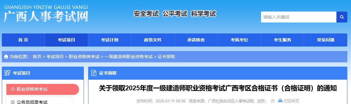 2025年度一级建造师职业资格考试广西考区合格证书(合格证明)已开始发放,现将领取有关事项通知如下: